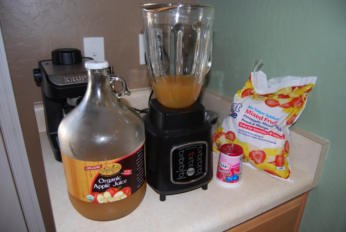 Frozen fruit, yogurt, juice & a blender and you've got the basics for deliciousness. My fruit of the freezer this day happens to be a combination of strawberries, mangos, pineapple & peaches. You can also keep separate bags on hand if you want to specialize the flavors. I generally have a large tub of plain yogurt on hand for these so it doesn't change the taste, but this morning I went for a blueberry yogurt.